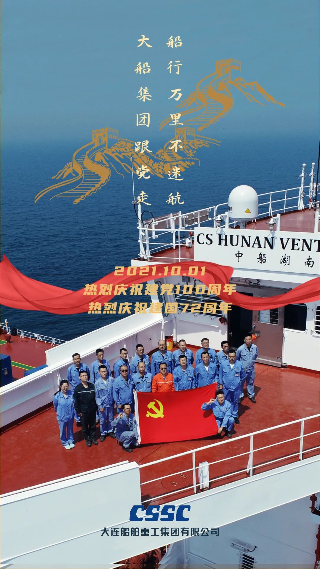 今天,我們迎來新中國72周年華誕。作為我國海軍裝備建設(shè)的主力軍,中國船舶大船集團(tuán)將不忘初心,牢記使命,堅(jiān)定貫徹海洋強(qiáng)國、制造強(qiáng)國、科技強(qiáng)國國家戰(zhàn)略,聚焦主責(zé)主業(yè)、聚力興裝強(qiáng)軍,為實(shí)現(xiàn)中華民族偉大復(fù)興的中國夢而不懈奮斗。