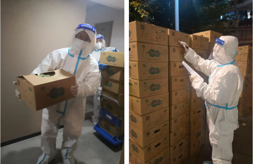 由于防護(hù)服有限,居住在黃浦區(qū)某社區(qū)的集團(tuán)職工中只有鄭珂成了志愿者,只見他時(shí)而忙著卸貨分裝,時(shí)而忙著打包標(biāo)記,7棟樓近400戶居民共計(jì)幾百公斤的物資,都由他一人完成了分裝和標(biāo)記工作。在他服務(wù)的對象中,既有身在涉疫樓棟無法出戶的同事,也有素未謀面的鄰居。