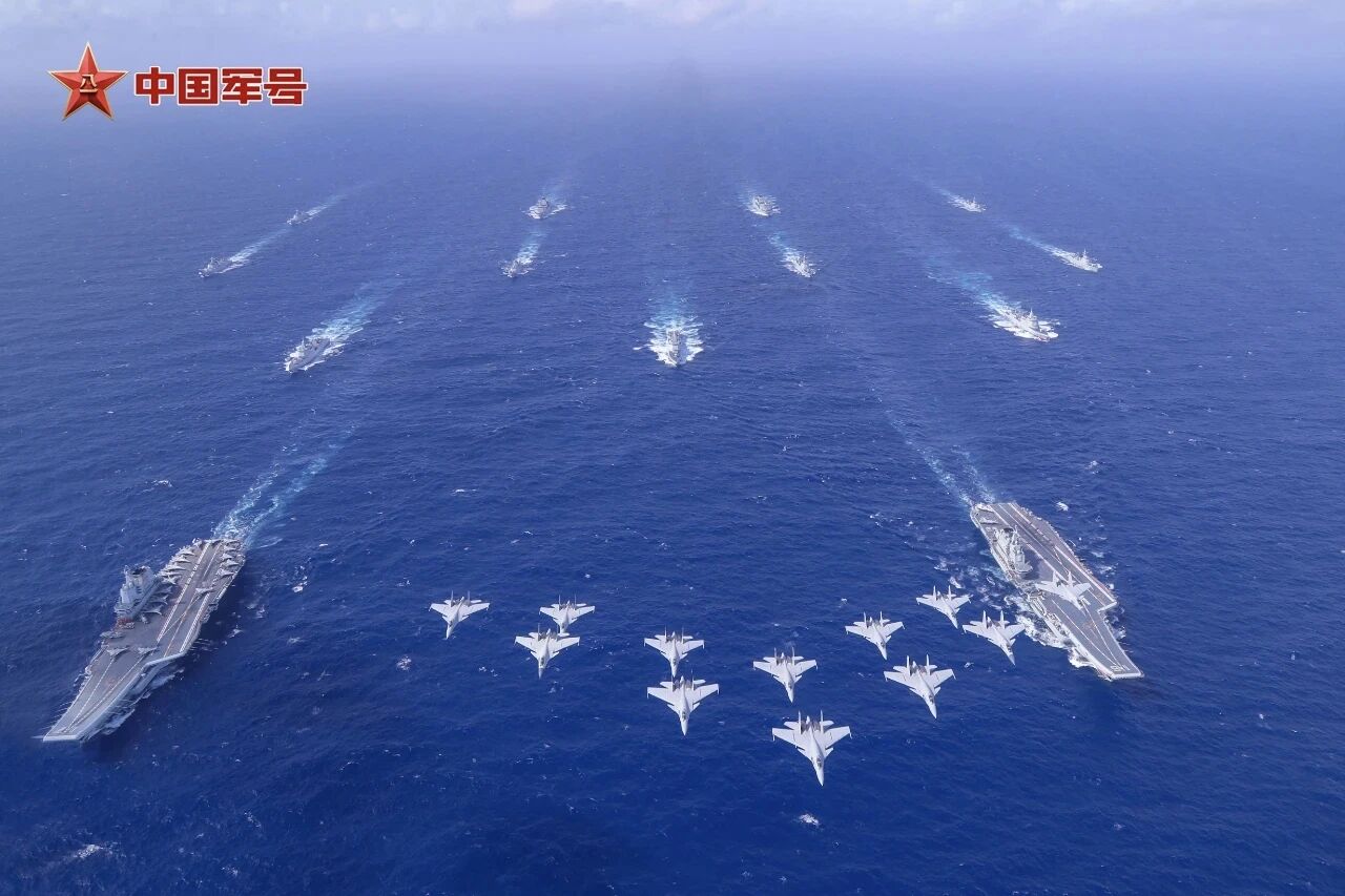 2024年10月,遼寧艦、山東艦編隊首次開展雙航母編隊演練。殲-15戰(zhàn)機組成楔形編隊飛過雙航母編隊上空。