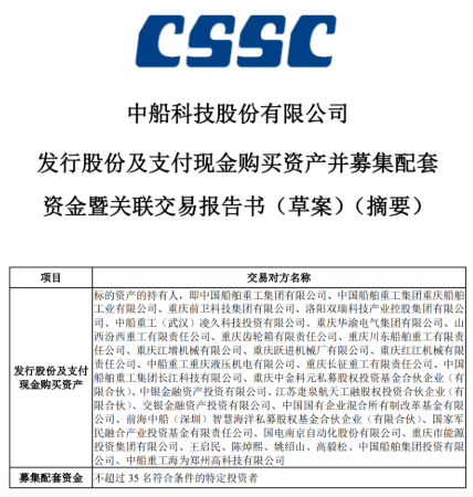 10月10日,中國(guó)船舶集團(tuán)有限公司旗下上市公司中船科技股份有限公司發(fā)布《發(fā)行股份及支付現(xiàn)金購(gòu)買資產(chǎn)并募集配套資金暨關(guān)聯(lián)交易報(bào)告書(草案)》等公告。根據(jù)公告,中船科技擬通過發(fā)行股份及支付現(xiàn)金的方式購(gòu)買交易對(duì)方持有的交易作價(jià)合計(jì)約為91.98億元的標(biāo)的資產(chǎn),并擬非公開發(fā)行股票募集不超過30億元的配套資金。該草案的公布標(biāo)志著中船科技重大資產(chǎn)重組取得具有里程碑意義的重要進(jìn)展。