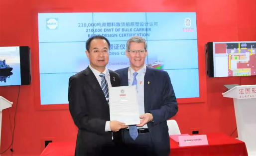 12月4日,法國船級社為中國船舶集團七〇八所簽發(fā)21萬噸雙燃料散貨船初步認可證書。