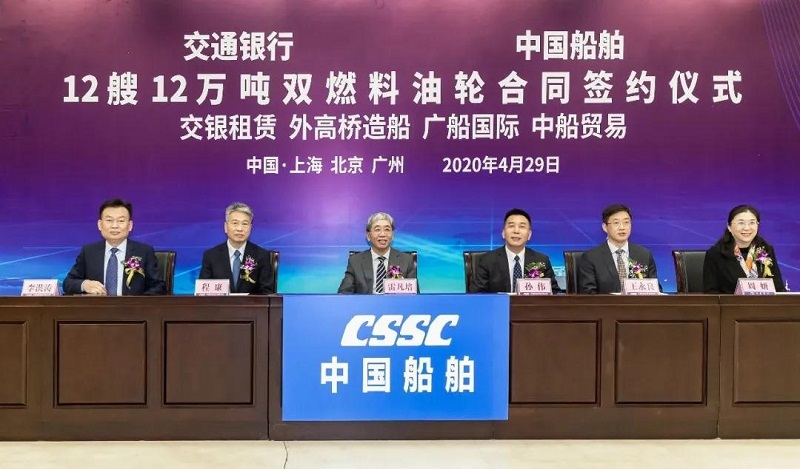 ????4月29日,中國船舶集團有限公司旗下中國船舶工業貿易有限公司、上海外高橋造船有限公司、廣船國際有限公司與交通銀行股份有限公司旗下交銀金融租賃有限責任公司在北京、上海、廣州三地以“云簽約”方式簽署12艘12萬噸雙燃料油船建造合同,合同總金額約46億元人民幣,這是中國船舶集團旗下單位近期承接的又一單筆大額訂單。中國船舶集團黨組書記、董事長雷凡培,交通銀行黨委書記、董事長任德奇,中國船舶集團黨組成員、副總經理孫偉,交通銀行黨委委員、副行長呂家進出席簽約儀式。