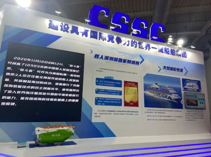在重大科技專項工程展區,中國船舶集團集中展示了在深海科學研究和海洋資源開發領域深化實施的“蛟龍”號、“深海勇士”號、“奮斗者”號三型載人深潛裝備等一批重大科技專項工程,以及取得的突破性、標志性的成果。其中,展會現場展示的“奮斗者”號創造了10909米的中國載人深潛深度紀錄。