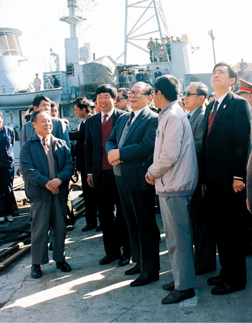 江澤民同志曾先后三次到江南造船視察。圖為1994年4月29日,江澤民同志視察江南造船。據相關人士回憶,當時江澤民同志視察江南有兩個原因,一是“五一”節快要到了,江澤民同志要看望工人階級,就選擇了江南造船,因為江南造船是產業工人的搖籃;第二個原因是112艦計劃當年5月8日前交艦,交艦前江澤民同志要先視察。