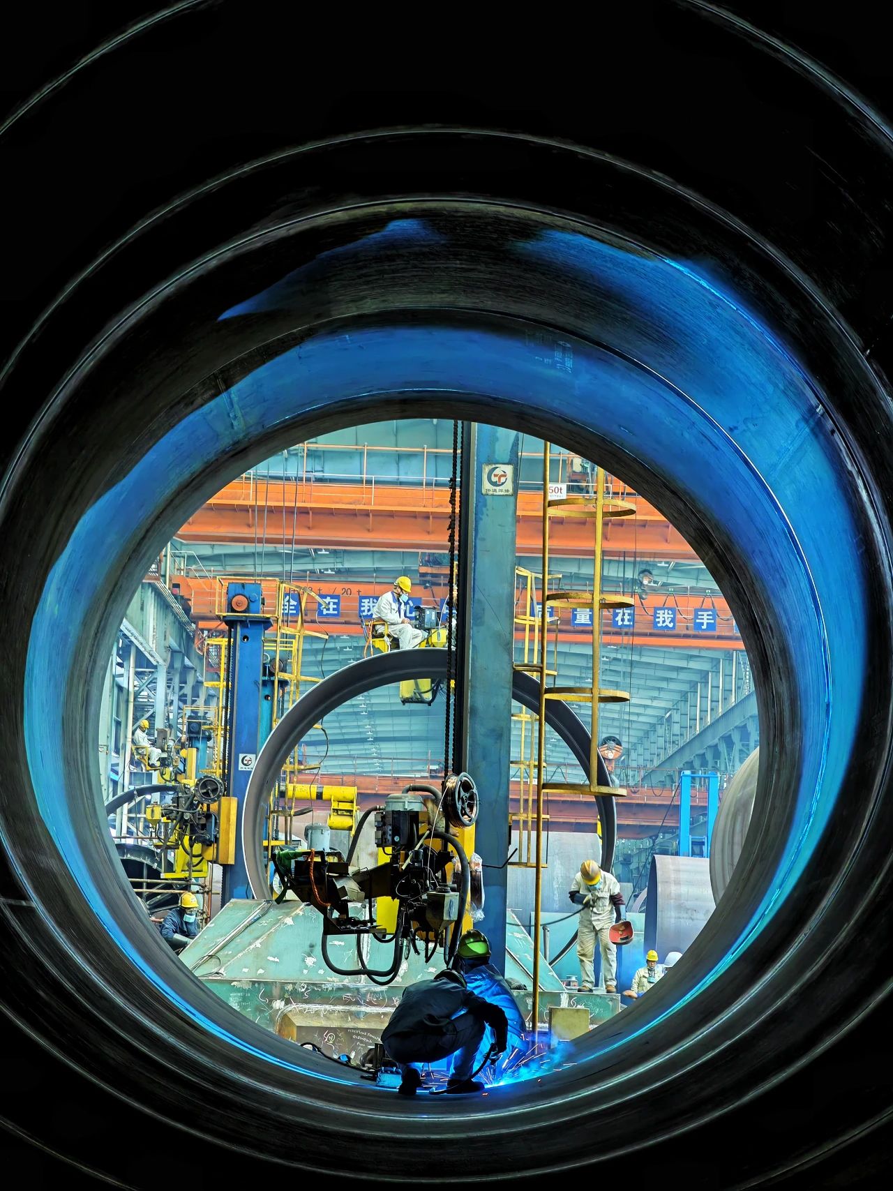 這是一幅難得一見的LNG船液貨艙內部場景,猶如外星飛船艙室的氛圍,正是我們造船工人一寸一寸建造而成。