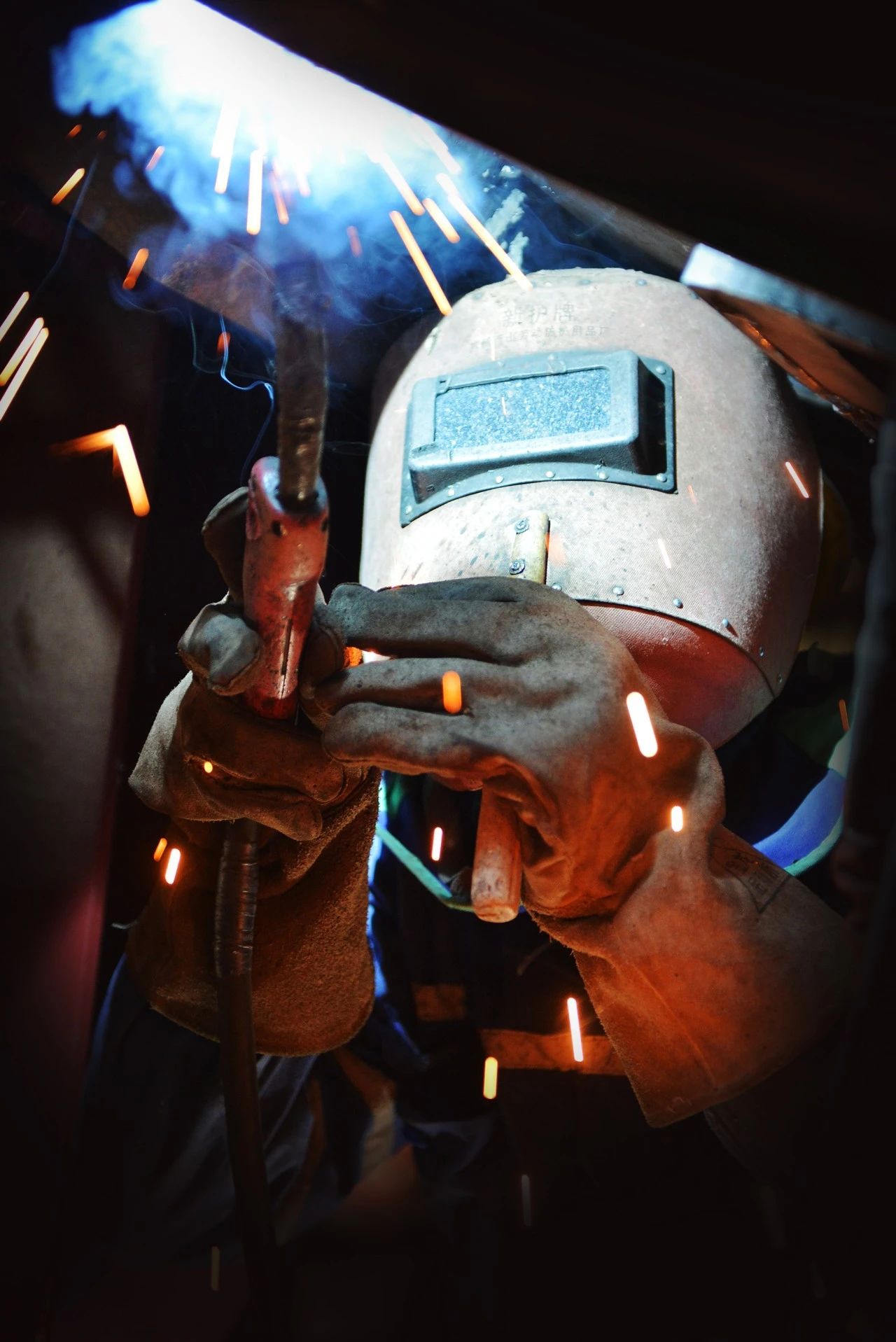 一位“全副武裝”正在進行焊接作業的焊工,焊花飛舞在狹小的工間里,折射出如彩云般的景象,猶如巨人正在“補天”。