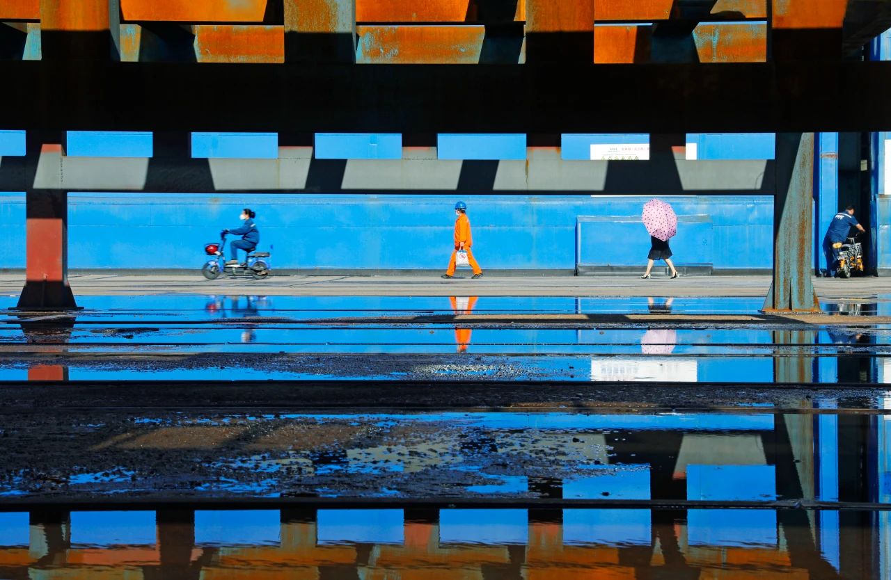 夏日清晨,一場大雨過后空氣透亮清新,廠區高跨門口服裝各異的職工行走在上班的路上,空地上擺放的工裝架與其自身的投影形成了獨特的畫框,讓畫面中行走的職工雖小卻很突出,起重工亮橙色的服裝、撐起的雨傘與明亮的藍色跨門形成色彩對比,使畫面活潑跳躍,職工們形形色色又從容有序,勾勒出廠區一隅的美麗風景。