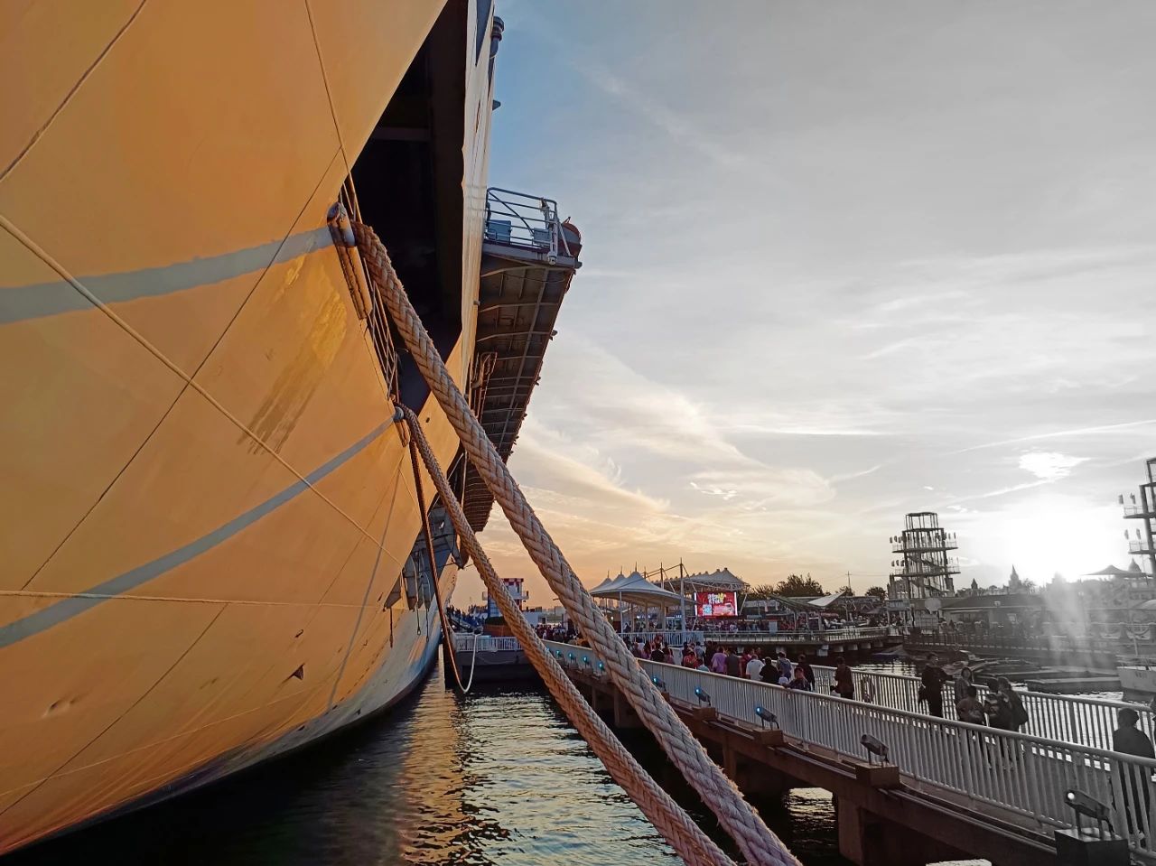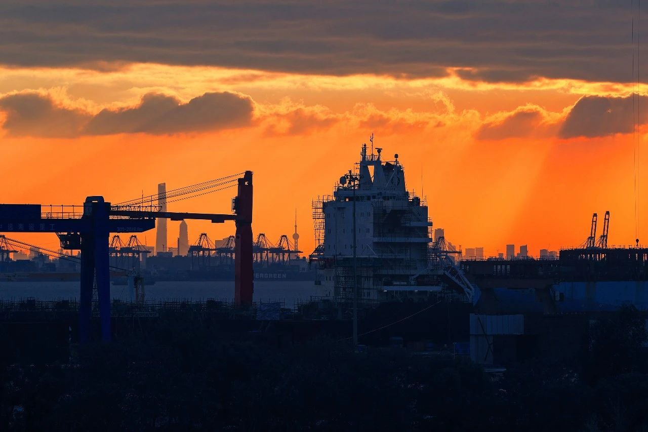 落日余暉下,造船現場燈火通明,展現出一派繁忙景象。在五彩斑斕的晚霞襯托下,整個造船基地猶如寶石般熠熠生輝。
