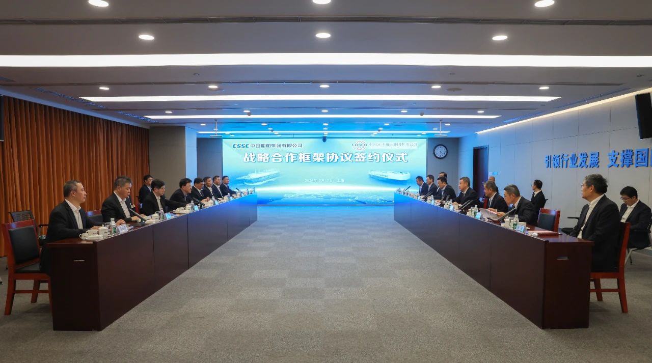 10月15日,中國船舶集團有限公司與中國遠洋海運集團有限公司在上海簽訂戰略合作框架協議。中國船舶集團黨組書記、董事長溫剛,中遠海運集團黨組書記、董事長萬敏,黨組副書記、總經理朱碧新出席簽約儀式。中國船舶集團黨組成員、副總經理盛紀綱,紀檢監察組組長、黨組成員彭宏,中遠海運集團黨組成員、副總經理、總會計師孫云飛出席簽約儀式。盛紀綱和孫云飛分別代表雙方在協議上簽字。簽約前,雙方就進一步加強溝通交流、深化多領域合作進行了交流探討。