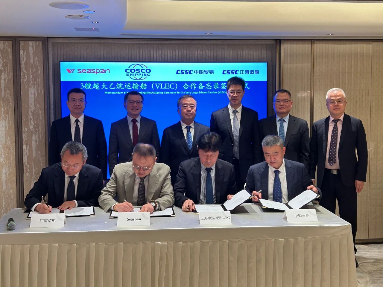 王國(guó)強(qiáng)同時(shí)見證了中船集團(tuán)與中旅集團(tuán)簽署戰(zhàn)略合作協(xié)議,中船集團(tuán)旗下江南造船聯(lián)合中船貿(mào)易與Seaspan、上海中遠(yuǎn)海運(yùn)LNG簽署超大乙烷運(yùn)輸船(VLEC)合作備忘錄;與相關(guān)中央企業(yè)舉行會(huì)談并簽署戰(zhàn)略合作協(xié)議。