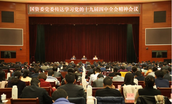 ????11月8日,國資委黨委召開傳達學習黨的十九屆四中全會精神會議,對國資委直屬機關、中央企業和直管協會學習貫徹落實工作進行部署安排。國資委黨委書記、主任郝鵬結合參加黨的十九屆四中全會現場聆聽習近平總書記重要講話的切身體會,結合國資國企實際作了宣講,強調要深入學習貫徹黨的十九屆四中全會精神特別是習近平總書記在全會上的重要講話精神,增強“四個意識”、堅定“四個自信”、做到“兩個維護”,切實把思想和行動統一到全會精神上來,進一步完善國資國企制度體系,深化國資國企改革,增強國有經濟競爭力、創新力、控制力、影響力、抗風險能力,做強做優做大國有資本,加快培育具有全球競爭力的世界一流企業,為實現“兩個一百年”奮斗目標、實現中華民族偉大復興的中國夢作出更大貢獻。國資委副主任、黨委委員趙愛明傳達了全會公報和《中共中央關于堅持和完善中國特色社會主義制度、推進國家治理體系和治理能力現代化若干重大問題的決定》(以下簡稱《決定》)主要精神。國資委副主任、黨委委員任洪斌主持會議。