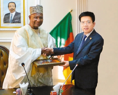 陜西建工集團黨委書記、董事長、總經理張義光(右)拜會喀麥隆旅游部長貝洛?布巴?邁加里先生(藺進士 攝)