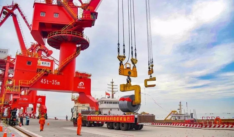 ????該門機主要用于成品鋼板、卷裝船及煤炭、廢鋼等裝卸船作業。門機配備有平衡掛梁、廢鋼吸盤、C字鉤、板杯夾鉗、散貨抓斗、六瓣廢鋼抓斗6種吊具,能滿足從鋼廠原材料海上進貨卸船,到成品(鋼卷、鋼板)裝船海運等整個過程的裝卸需求,改變了鋼廠以往只能依靠陸地貨運進行成品運輸的狀況,極大地提高運輸效率。