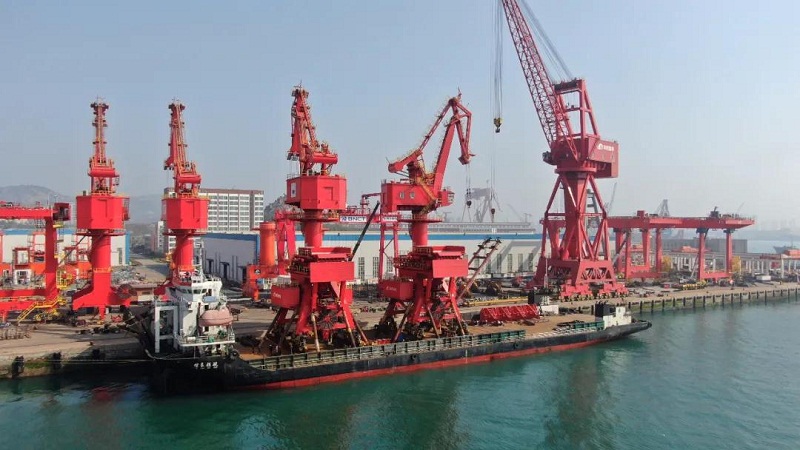 ????近日,武漢船機海西重機為寧波舟山港老塘山碼頭打造的2臺25T-36M四連桿帶斗門機順利交付。門機額定起重量25噸,工作幅度36米,額定工作效率800噸/時,主要用于煤炭和海沙的卸船作業。