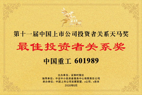 ????中國船舶集團旗下中國重工于近日榮獲由證券時報社主辦的“第11屆中國上市公司投資者關系天馬獎——最佳投資者關系獎”,滬深兩市共有100家上市公司獲得該獎項。