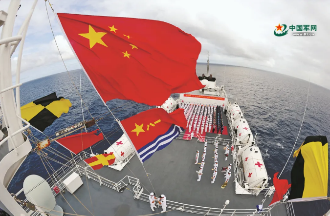 “和平方舟”號醫(yī)院船在大洋上舉行隆重升旗儀式。來源:中國軍網(wǎng) 江 山攝