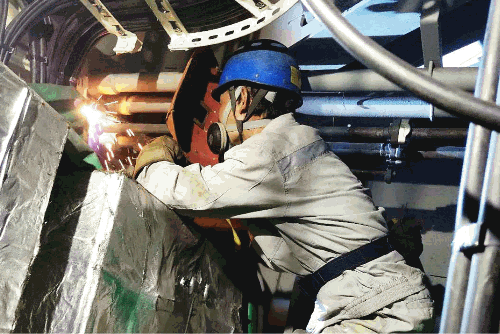 為保證臺風來臨前能夠進入錨地安全拋錨,大連公司海工公司員工戰(zhàn)高溫搶節(jié)點,狹小的空間里進行焊接作業(yè)。