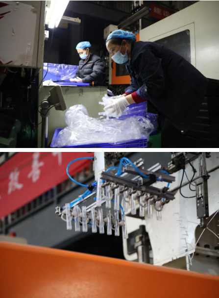 為保障防疫物品供應,春節期間,前衛公司精密模塑產業生產車間24小時不停機。各機臺滿負荷運轉,每天生產咽拭子棉簽棒1000萬支,一次性保存管70萬支,為全國核酸檢測能力的提升提供了強有力的保障。