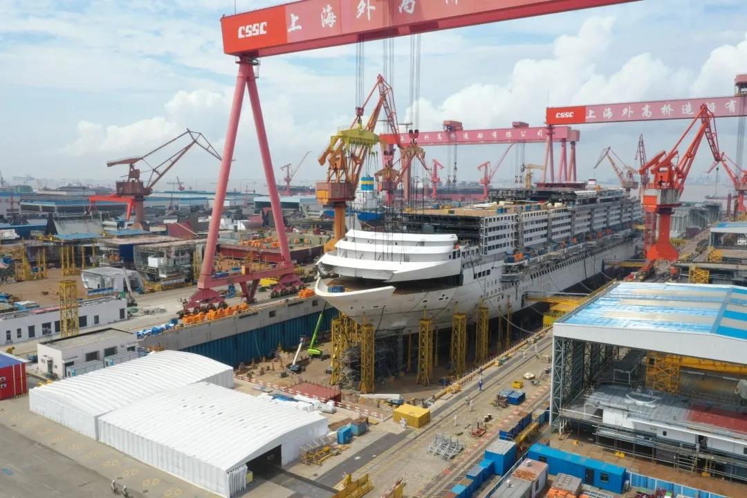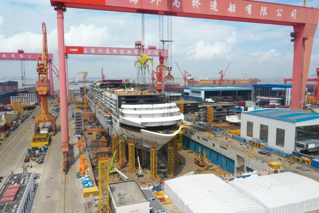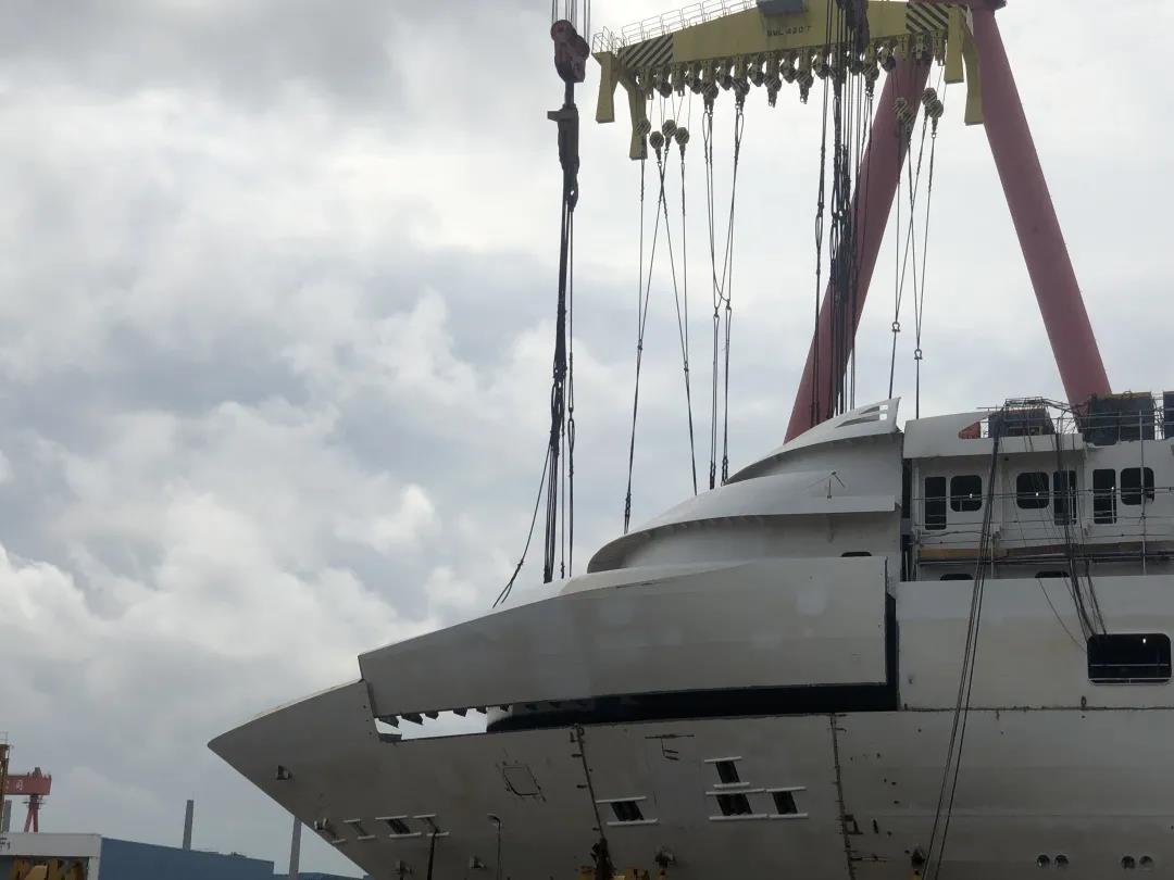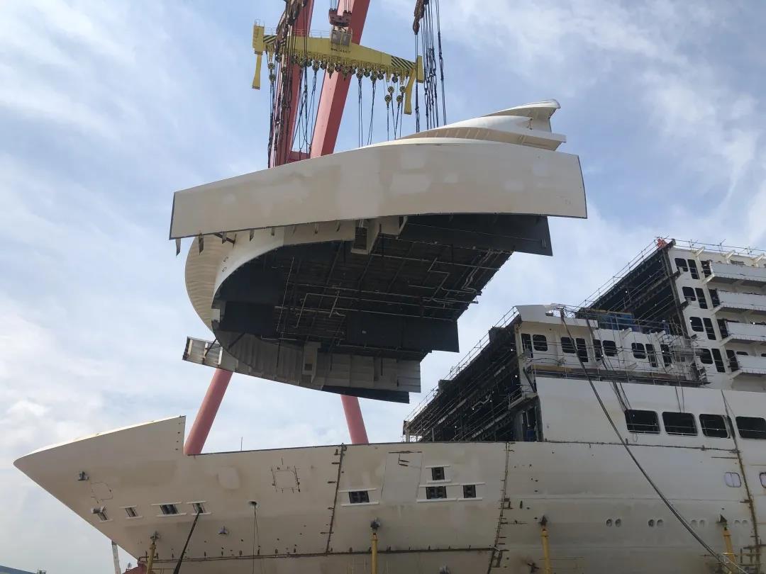 國產(chǎn)首制大型郵輪完成首個艏部總段吊裝! 預(yù)計9月實(shí)現(xiàn)全船結(jié)構(gòu)貫通。
