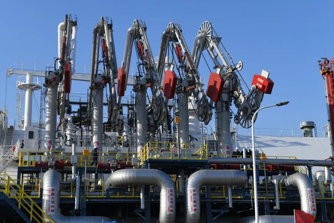 當天中午,隨著“中能連云港”號液化天然氣運輸船順利靠港,即將投用的天津LNG接收站二期碼頭現場熱火朝天。15點30分左右,首套國產卸料臂與國內外四臺卸料臂先后開始船岸對接工作。