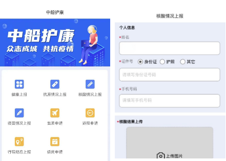 物資公司與樂普(北京)醫(yī)療器械股份有限公司合作開發(fā)的“中船護康”健康監(jiān)測上報系統(tǒng),具備員工健康上報、抗原檢測、核酸情況、疫苗接種、行程動態(tài)5種上報模塊,以及出差、返程、返崗3類申請,共8大功能,在數(shù)字化防疫方面做出了新的嘗試。