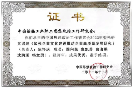 近日,由中國船舶工業職工思想政治工作研究會申報的中國思想政治工作研究會2022年委托課題《加強企業文化建設,推動企業高質量發展研究》評審結果公布,成果優秀,報經中央宣傳部領導審定準予結項。這是中國船舶政研會首次承擔中國政研會委托課題并獲評優秀。