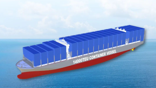 14000TEU甲醇燃料預留大型集裝箱船總長約336米,型寬 51米,型深30.2米,可裝載14170個20英尺標準集裝箱。采用最新設計理念,在常規燃料動力推進系統基礎上,預留甲醇燃料推進方案,可滿足船東后續綠色燃料改裝的需求。同時,配置脫硫塔及其他節能裝置,具有綜合能耗低、船舶快速性強和綠色環保優等特點,總體性能達到世界先進水平,計劃于2026至2027年完工交付。