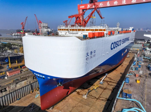 12月2日,中國船舶集團旗下外高橋造船首制8600車液化天然氣(LNG)雙燃料動力汽車運輸船(PCTC)順利出塢,達成船塢周期100天既定目標,即下塢至起浮50天,起浮至出塢50天,在民船建造領域繼續保持“加速度”。