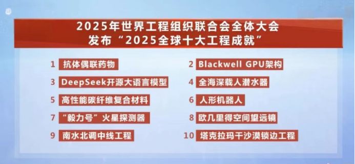 由中國(guó)工程院院刊《Engineering(工程)》評(píng)選,經(jīng)由全球征集提名、專家遴選推薦、公眾問卷調(diào)查、評(píng)選委員會(huì)審議后確定,具有高度權(quán)威性和國(guó)際影響力。本次入選項(xiàng)目涵蓋航天探索、資源開發(fā)、人工智能、材料科學(xué)等多個(gè)領(lǐng)域。與“奮斗者”號(hào)全海深載人潛水器一同入選的還有Deepseek開源大語言模型、南水北調(diào)中線工程等全球重大工程創(chuàng)新成果。