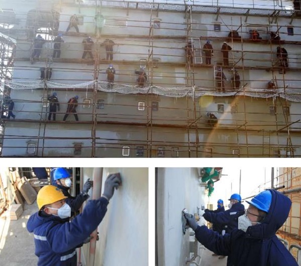 為確保該船按期實現試航節點,大船集團山船重工先后組織150余名黨員干部投入到該船生活區外板拉毛工程中。黨員們根據所分配的區域,站在十幾米高的腳手架上,手里拿著磨砂紙,一點一點地磨,一塊一塊地蹭,不放過每個細節。