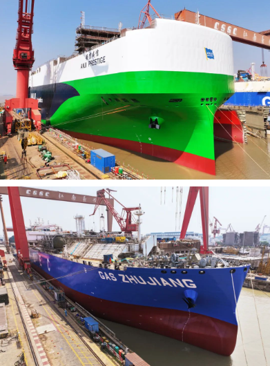 8月11日,中國船舶集團旗下江南造船4號船塢迎來一艘99000立方米超大型乙烷乙烯運輸船(VLEC)和一艘7800車位汽車運輸船(PCTC)出塢 ,一艘99000立方米VLEC半船和一艘7800車位PCTC半船同步起浮,達成了“PV同步”建造模式的首批次出塢。
