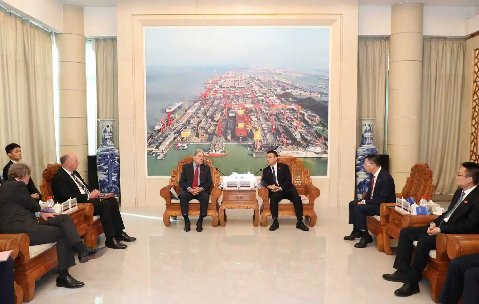 新西蘭外交部兼鐵道部部長Winston Peters(溫斯頓·彼得斯)、新西蘭FHL公司董事長Chris McKenzie(克里斯·麥肯齊)、中船集團副總經理彭原璞出席簽約儀式并致辭,新西蘭駐華大使Jonathan Austin(喬·文博)、駐廣州總領事Michael Zhang(張典)等出席簽約儀式。
