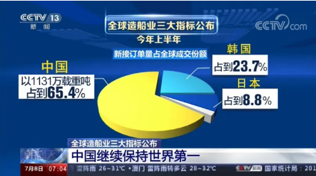 全球權威航運造船機構公布的最新數據顯示,今年上半年,全球造船業三大指標,中國再次領先,繼續保持世界第一的紀錄。