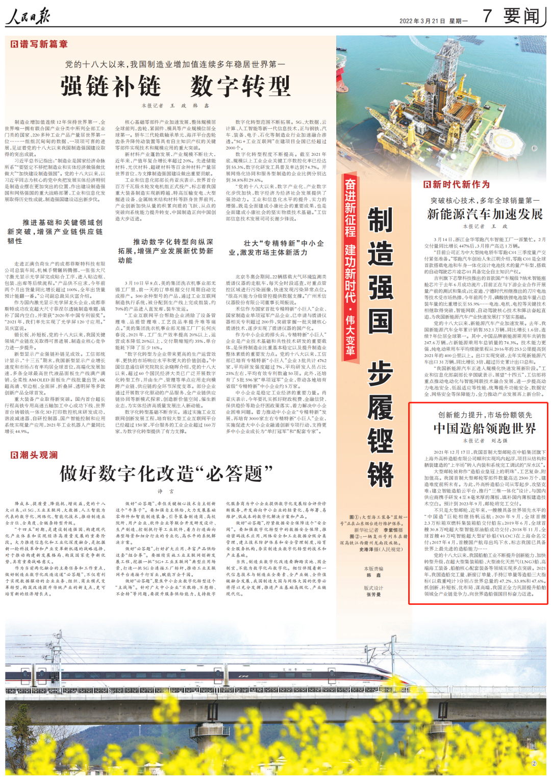 黨的十八大以來,我國船舶工業(yè)不斷提升創(chuàng)新能力、加快轉(zhuǎn)型升級,在超大型集裝箱船、大型液化天然氣(LNG)船、高端海工裝備、船舶核心配套裝備等領(lǐng)域?qū)崿F(xiàn)多點突破。2021年,我國造船完工量、新接訂單量、手持訂單量等造船三大指標(biāo)(以載重噸計)分別占世界總量的47.2%、53.8%和47.6%。抓創(chuàng)新、補短板、優(yōu)布局、謀高端,我國正全力鞏固提升船舶領(lǐng)域全產(chǎn)業(yè)鏈競爭力,向世界造船強國目標(biāo)奮力邁進。