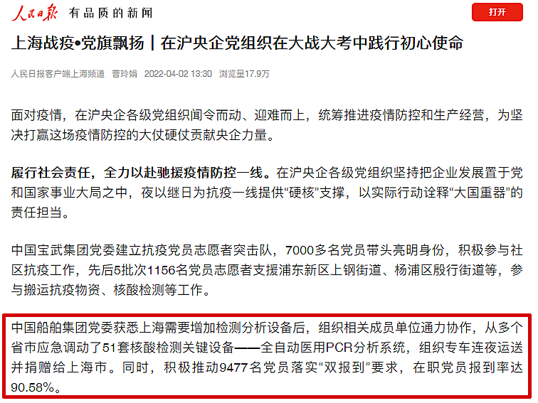 “中國船舶集團(tuán)黨組獲悉上海需要增加檢測分析設(shè)備后,組織相關(guān)成員單位通力協(xié)作,從多個(gè)省市應(yīng)急調(diào)動(dòng)了51套核酸檢測關(guān)鍵設(shè)備——全自動(dòng)醫(yī)用PCR分析系統(tǒng),組織專車連夜運(yùn)送并捐贈(zèng)給上海市。同時(shí),積極推動(dòng)9477名黨員落實(shí)‘雙報(bào)到’要求,在職黨員報(bào)到率達(dá)90.58%?!?/p>