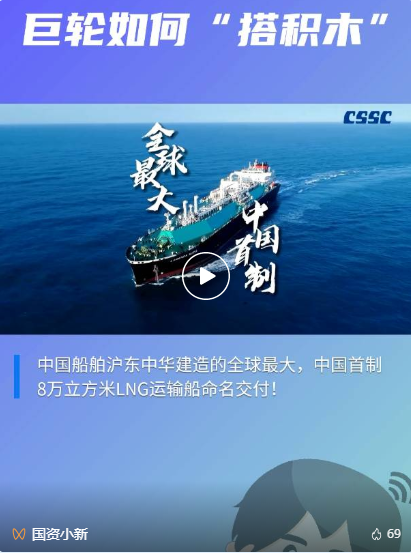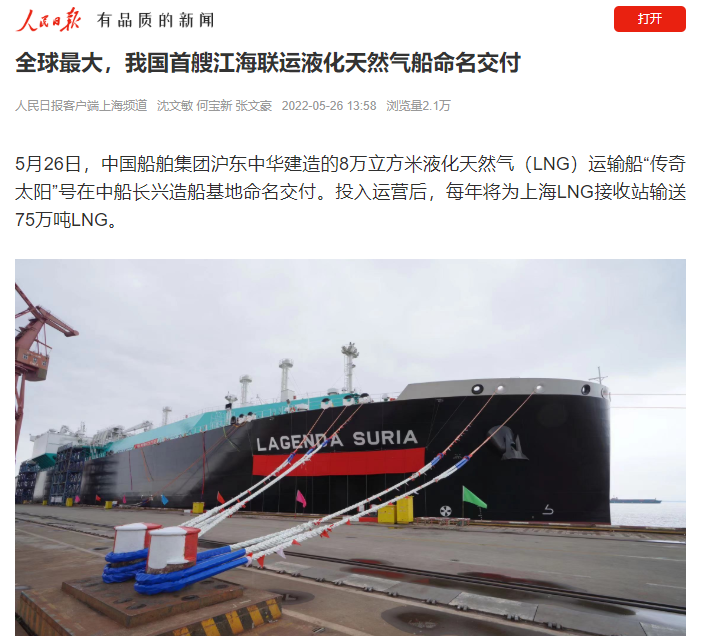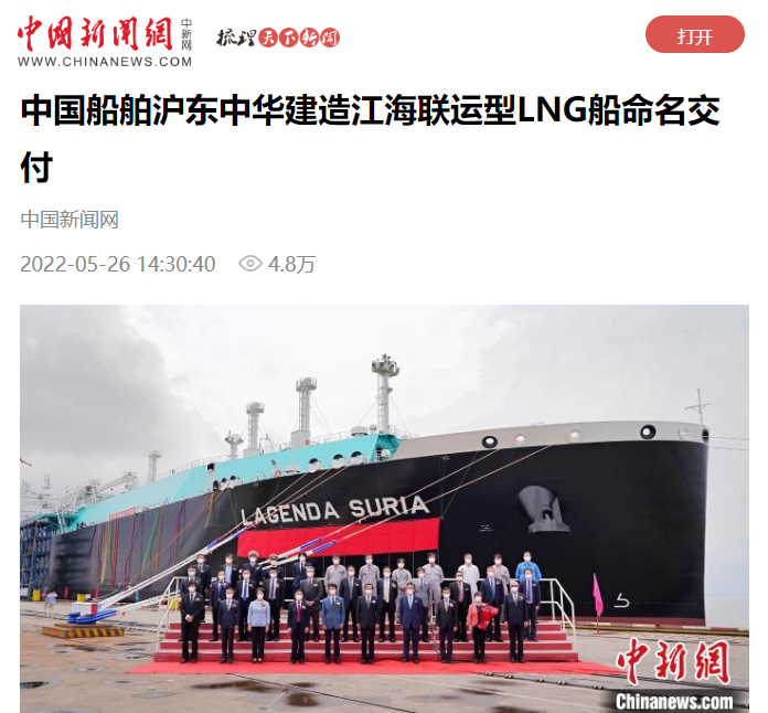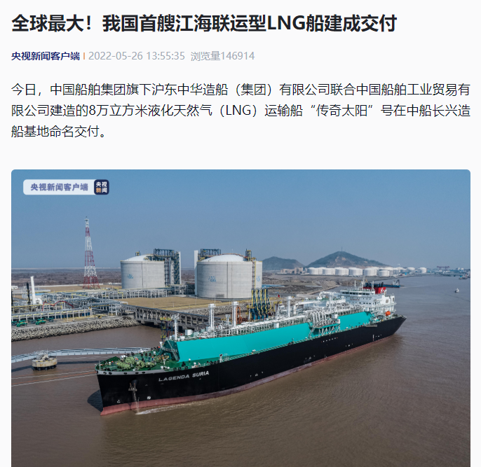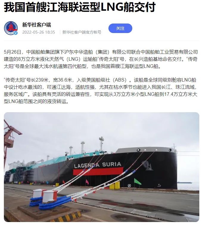 5月26日,中國船舶集團旗下滬東中華聯合中船貿易建造的8萬立方米液化天然氣(LNG)運輸船“傳奇太陽”號在長興造船基地命名交付。“傳奇太陽”號是全球最大淺水航道第四代、我國首款首制首艘江海聯運型LNG船,填補了中國淺水航道LNG船的空白,在該細分市場占有率最高,有望成為中國船舶制造的又一精品船型。