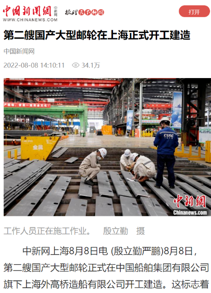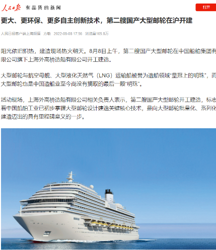 8月8日,第二艘國產大型郵輪在中國船舶集團旗下外高橋造船開建,這標志著中國船舶工業已初步掌握大型郵輪設計建造關鍵核心技術。