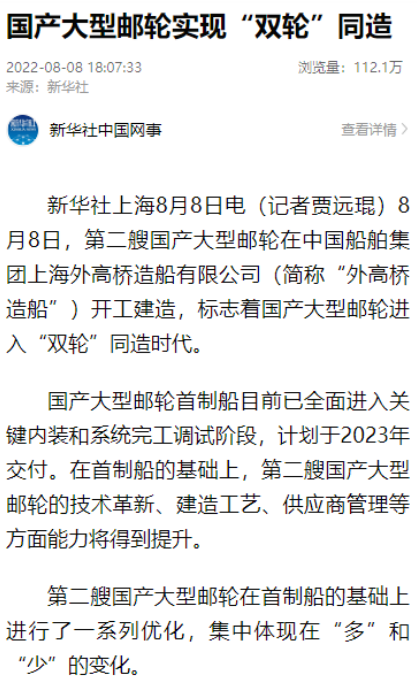 目前國產大型郵輪首制船正處于內裝階段,“差不多裝修了一半”,第二艘國產大型郵輪詳細設計已完成約40%。未來,國產大型郵輪有望實現批量化、系列化建造敬請期待。
