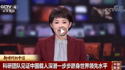 系列報道《新時代的中國》之《科研團隊見證中國載人深潛一步步躋身世界領先水平》,于9月25日在央視中文國際頻道《中國新聞》欄目和《今日環球》欄目面向全球播出。