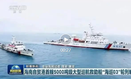 海南自貿港目前噸位最大、裝備最先進、綜合能力最強的海事公務船5000噸級大型巡航救助船“海巡03”號正式列編海南海事局。