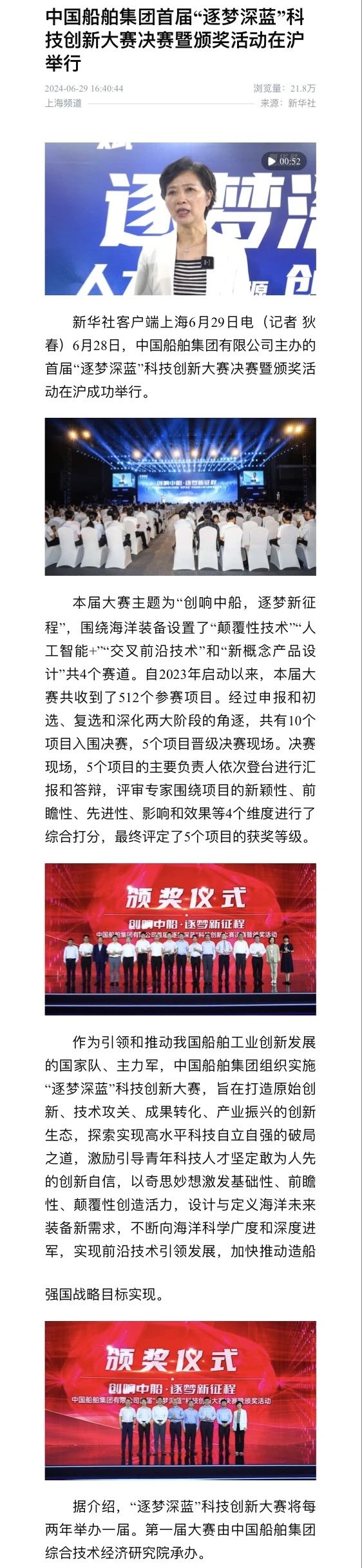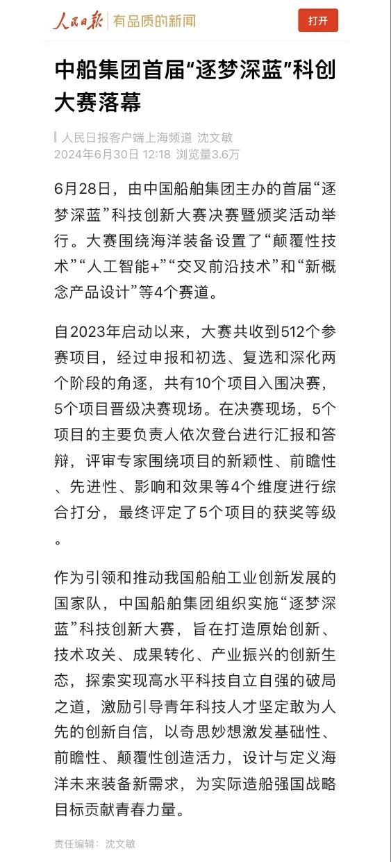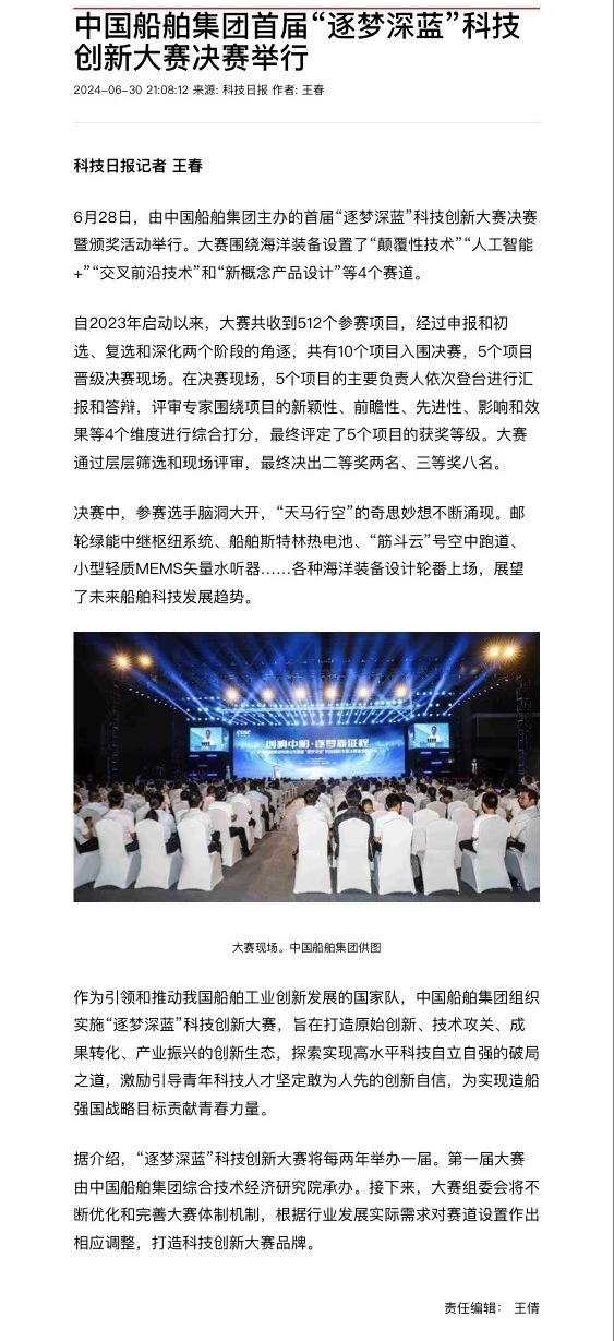 中國船舶集團有限公司主辦的首屆“逐夢深藍”科技創(chuàng)新大賽決賽暨頒獎活動引來各大媒體的關注,獲得高度評價。——>活動回顧